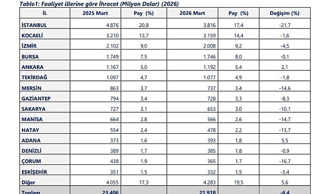 Ticaret Bakanlığı verilerine göre 2026 Ocak-Mart döneminde 40 ilde ihracat artışı yaşanırken, 14 il 1 milyar doların üzerinde ihracat gerçekleştirdi.Ticaret Bakanlığı, yılı Ocak-Mart dönemi ihracat verilerini açıkladı. Bakanlıktan paylaşılan verilere göre 40 ilde ihracat artışı kaydedilirken, 14 il 1 milyar doların üzerinde ihracat gerçekleştirdi. Körfez savaşının 50 gündür devam ettiği vurgulanan açıklamada, savaşın olumsuz etkileri ve takvim etkisi nedenleriyle, Ocak-Mart döneminde ihracatın yüzde 3,1 oranında azalışla 63 milyar 279 milyon dolar olarak gerçekleştiği belirtildi.Bakanlık tarafından yapılan açıklamaya göre Mart ayında, İstanbul, Kocaeli, İzmir, Bursa ve Ankara ihracatta ilk beşte yer alan iller olurken, Tekirdağ, Mersin, Gaziantep, Sakarya ve Manisa ikinci beşte yer alan iller oldu. Faaliyet illeri bazında Mart 2026 ihracat sıralamasında 3 milyar 816 milyon dolarla İstanbul ilk sırada yer aldı. Kocaeli 3 milyar 159 milyon dolar ile ikinci, İzmir 2 milyar 8 milyon dolar ile üçüncü, Bursa 1 milyar 746 milyon dolar ile dördüncü, Ankara ise 1 milyar 192 milyon dolar ile beşinci oldu.İhracatını en çok artıran iller sırasıyla Yalova, Şırnak, Kırıkkale, Elâzığ ve DüzceGeçen yılın aynı ayına göre ihracatını en çok artıran iller sırasıyla Yalova, Şırnak, Kırıkkale, Elâzığ ve Düzce oldu. Ticaret Bakanlığı, yüksek katma değerli üretim ve rekabetçi ihracat stratejileri doğrultusunda pazar ve ürün çeşitlendirmesine yönelik çalışmaların sürdüğünü, ihracatın ülke geneline yayılmasının hedeflendiğini belirtti.