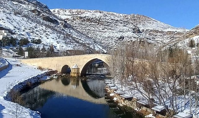 Diyarbakır'ın Çermik ilçesinde bulunan Artuklu eseri tarihi Haburman Köprüsü, ilk günkü ihtişamı ile ayakta durmaya devam ediyor. Yaklaşık 850 yıllık tarihi köprü, karla birlikte seyrine doyumsuz manzara oluşturdu.