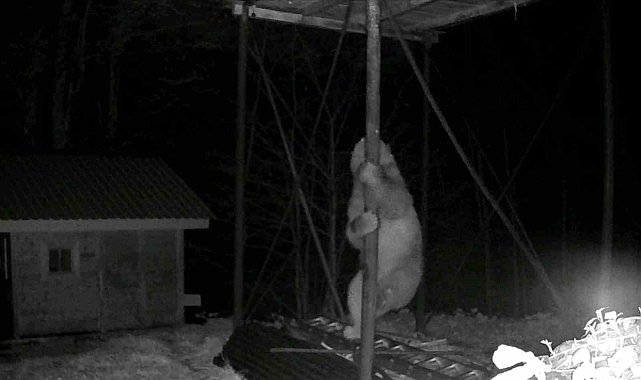 Rize'de aç kalan ayı karnını doyurmak için keşfettiği kovanlara ulaşmak için düz demire tırmanmaya çalıştı. O anlar güvenlik kamerasına anbean yansıdı.Rize'nin Hemşin ilçesine bağlı Mutlu Mahallesi'nde kış uykusundan uyanarak yiyecek bir şeyler arayan ayı yerden yüksekte kurulan kovanların konulduğu standı keşfetti. Şefik İnce'ye ait kovanların altında bir keşif yapan ayı demire tırmanarak kovanlara ulaşmaya çalıştı ancak bunda başarılı olamadı.O anlar ise kovan sahibinin kurduğu güvenlik kamerasına anbean yansıdı. Görüntülerde ayının kovanlara ulaşmak için birden fazla kez demire tırmanmaya çalıştığı gözlendi.