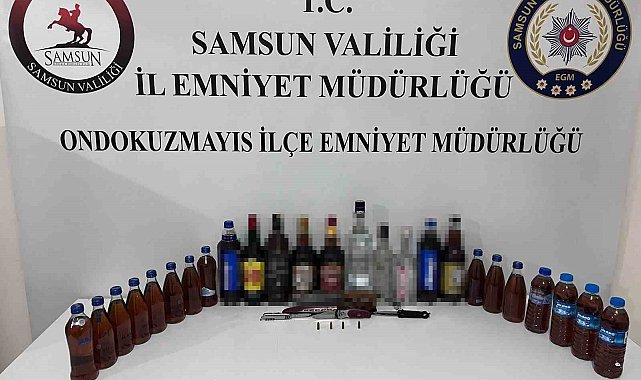Samsun'un 19 Mayıs ilçesinde yapılan denetimde 1.64 promil alkollü olduğu belirlenen sürücünün aracından şişeler içinde el yapımı sahte içki, bıçak ve fişek ele geçirildi.Samsun İl Emniyet Müdürlüğü ekiplerince 19 Mayıs ilçesinde gerçekleştirilen uygulamada şüpheli bir araç durduruldu. Araç sürücüsü A.A.'nın yapılan kontrolde 1.64 promil alkollü olduğu tespit edildi.Araçta yapılan aramalarda içinde çok sayıda sahte el yapımı içki olduğu değerlendirilen şişeler, 4 adet bıçak ve 4 adet 6.35 mm fişek ele geçirildi. Ele geçirilen malzemelere el konulurken, olayla ilgili şahıs hakkında Türk Ceza Kanunu'nun 179/3 maddesi ile 5607 ve 6136 sayılı Kanunlar kapsamında adli işlem başlatıldı.