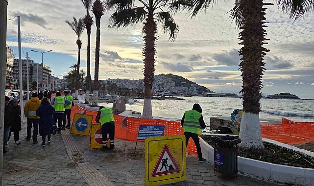 Kuşadası Atatürk Bulvarı sahil şeridinde, kuvvetli dalgalar ve olumsuz hava şartlarının ardından oluşan hasarların giderilmesi amacıyla çalışma başlatıldı.