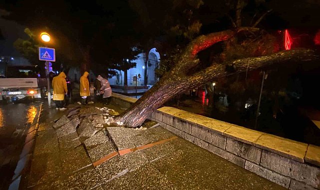 Aydın'ın Efeler ilçesi kent merkezinde Bey Camii önündeki kaldırımda bulunan çam ağacı gün boyu etkili olan sağanak yağmur nedeniyle devrilirken, gece saatlerinde yolun boş olması muhtemel bir facianın önüne geçti.