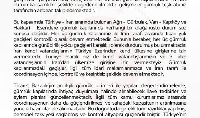 Ticaret Bakanı Ömer Bolat, "Türkiye'nin İran ile olan gümrük kapılarındaki mevcut durum kapsamlı bir şekilde değerlendirilmekte; gelişmeler gümrük teşkilatımız tarafından anbean takip edilmektedir" dedi.