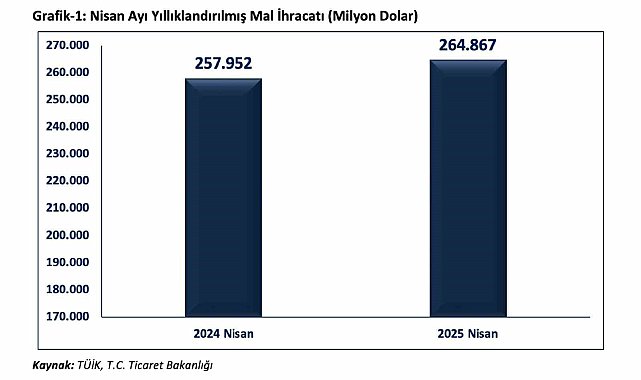 Ticaret Bakanı Ömer Bolat, "2025 Nisan ayı itibari ile yıllıklandırılmış ihracatımız bir önceki yılın aynı ayına göre 6,9 milyar dolar artarak tüm zamanların en yüksek değeri olan 264,9 milyar dolara ulaşmıştır" dedi.
