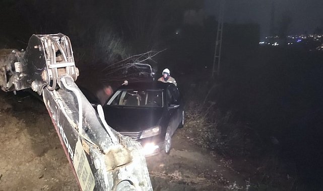 Hatay'da yağışlı havayla birlikte yaşanan toprak kaymasıyla uçurumun kenarında mahsur kalan araç kurtarıldı.