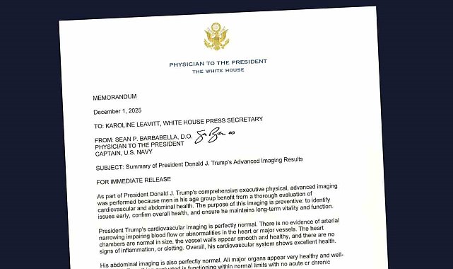 Beyaz Saray'dan yapılan açıklamada, ABD Başkanı Donald Trump'ın kalp-damar ve karın bölgesi ile ilgili MR (Manyetik Rezonans Görüntüleme) sonuçlarının tamamen normal olduğu belirtilerek, "Bulgular, kendisinin genel sağlık durumunun son derece iyi olduğunu doğrulamaktadır" denildi.