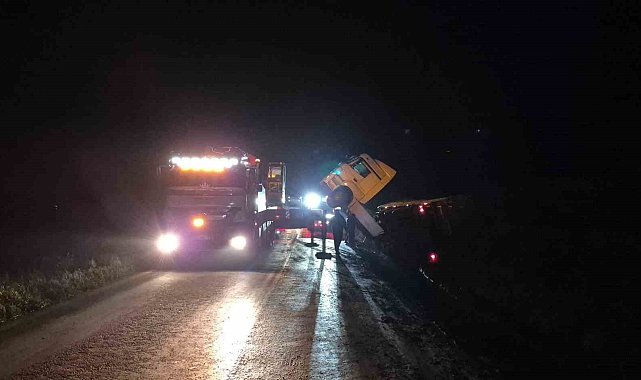 Bilecik'te seyir halinde kontrolden çıkan tır devrilirken, yaşanan kaza trafiği olumsuz etkiledi.Kaza; dün gece yarısı Bilecik'in Osmaneli ilçesi İznik-Pamukova kara yolunda meydana geldi. Karayolunda seyir halindeki bir tırın sürücüsü aracın direksiyon hâkimiyetini kaybetti. Kontrolden çıkan araç devrilirken, şans eseri kazada ölen veya yaralanan olmadı. Tır çekici yardımıyla kaza yerinden kaldırılırken, bu esnada yol geçici olarak trafiğe kapatıldı. İznik- Pamukova kara yolu, çekiciye aracın kaldırılmasına ardından trafiğine açıldı.