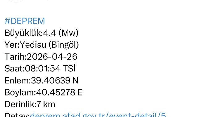 Merkez üssü Bingöl'ün Yedisu ilçesi olan 4.4 büyüklüğünde deprem meydana geldi.Afet ve Acil Durum Yönetimi Başkanlığı Deprem Dairesi Başkanlığından alınan bilgiye göre, saat 08:01'de merkez üssü Bingöl'ün Yedisu ilçesinde 4.4 büyüklüğünde deprem meydana geldi. Yerin yaklaşık 7 kilometre derinliğinde meydana gelen depremle ilgili olumsuz bir durum yaşanmadığı öğrenildi.