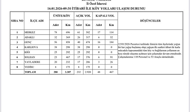Bingöl'de etkili olan kar yağışı sonrası kapanan 232 köy yolu ulaşıma açılırken 48'inde ise çalışmalar sürüyor.Bingöl'de etkili olan kar yağışı sonrası yüzlerce köy yolu ulaşıma kapanmıştı. İl Özel İdaresi, 110 personel ve 53 araç ile çalışmalarını aralıksız sürdürüyor. Çalışmalar çerçevesinde 280 köy yolundan 232'si ulaşıma açılırken, 48 köy yolunda ise çalışmaların sürdüğü bildirildi.