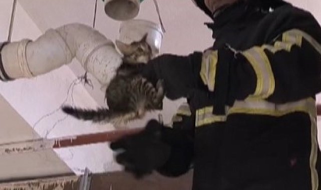 Hatay'ın Reyhanlı ilçesinde boru içinde mahsur kalan yavru kediyi, itfaiye ekipleri kurtardı.