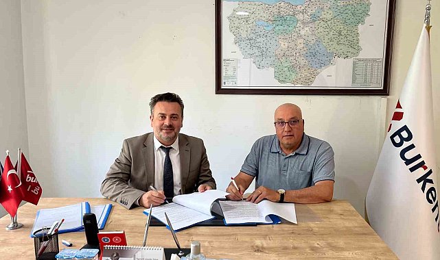 Bursa Büyükşehir Belediyesi iştiraklerinden BURKENT'te çalışan personeli ilgilendiren toplu iş sözleşmesi, BURKENT Genel Müdürü İnan Keser ve Yol-İş Sendikası Bursa 2 No'lu Şube Başkanı Durmuş Şen arasında imzalandı.