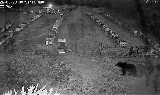 Uludağ eteklerindeki bir köye yakın arı çiftliğine gece saatlerinde giren ayı ailesi, arıcıların kabusu oldu. Anne ayı ve iki yavrusunun kovanlara ulaşmaya çalıştığı anlar güvenlik kameralarına yansıdı.