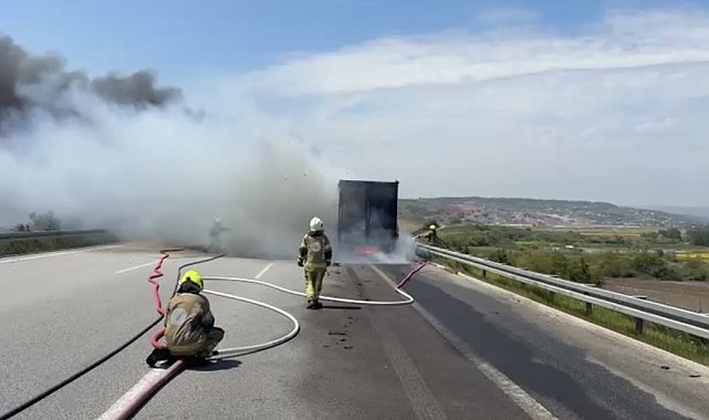 Bursa İzmir Yolu Batı gişeleri mevkiinde presli karton yüklü bir tırda çıkan yangın, aracı kısa sürede küle çevirdi.Edinilen bilgiye göre, seyir halindeki tırın dorsesinde henüz belirlenemeyen bir nedenle yangın çıktı. Presli kartonların tutuşmasıyla alevler kısa sürede büyüyerek tüm dorsayı sardı. Alevlerin hızla yükselmesi üzerine sürücü, aracı emniyet şeridine çekerek kendini dışarı attı ve durumu itfaiyeye bildirdi.İhbar üzerine bölgeye çok sayıda itfaiye ekibi sevk edildi. Olay yerine ulaşan ekipler, yoğun duman ve alevlere rağmen yangına müdahale ederek kontrol altına aldı. Uzun süren çalışmaların ardından yangın tamamen söndürülürken, tırın büyük bölümü kullanılamaz hale geldi.Yangın nedeniyle İzmir Yolu'nda kısa süreli trafik yoğunluğu oluştu. Polis ekipleri bölgede güvenlik önlemi alırken, itfaiye ve olay yeri inceleme ekipleri yangının çıkış nedenine ilişkin çalışma başlattı.Olayda herhangi bir can kaybı ya da yaralanma yaşanmaması ise tek teselli oldu.