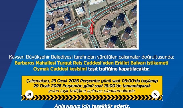 Kayseri Büyükşehir Belediyesi tarafından kentte yapılacak yol çalışmaları nedeniyle sürücülere uyarı yapıldı.Kayseri Büyükşehir Belediyesi tarafından yapılan uyarıda, "Kayseri Büyükşehir Belediyesi tarafından yürütülen çalışmalar doğrultusunda Barbaros Mahallesi Turgut Reis Caddesi'nden Erkilet Bulvarı istikameti Oymak Caddesi kesişimi taşıt trafiğine kapatılacaktır. Çalışmalara 29 Ocak 2026 Perşembe günü saat 09:00'da başlanıp 29 Ocak 2026 Perşembe günü saat 18:00'de tamamlayarak yolun taşıt trafiğine açılması planlanmaktadır. Yapılan çalışmalar doğrultusunda Cırgalan Mahallesi'nden Buğdaylı Mahallesi'ne gidiş ve geliş Şehit Mehmet Erciyes Caddesi üzerindeki Buğdaylı köprüsü taşıt trafiğine kapatılacaktır. Çalışmalara 29 Ocak 2026 Perşembe günü saat 09:00'da başlanıp 29 Ocak 2026 Perşembe günü saat 18:00'de tamamlanarak yolun taşıt trafiğine açılması planlanmaktadır" ifadelerine yer verildi.
