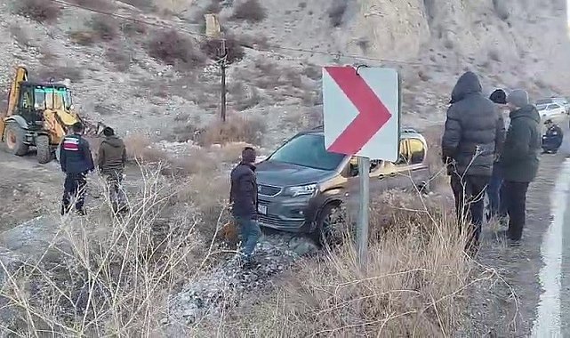 Erzurum-Artvin karayolunda buzlanmadan dolayı yoldan kayan otomobil yol kenarına uçtu.