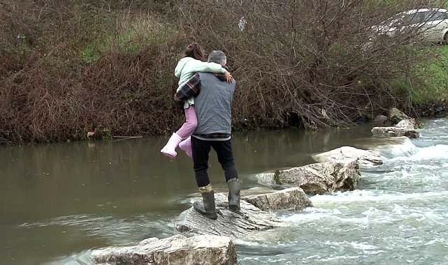 Çatalca'da kış aylarında taşan ve üzerinde o bölgede köprü bulunmayan dere nedeniyle mahalle sakinleri evlerine ulaşmakta zorlanıyor. Büyük risk alarak derenin üstündeki taşlara basarak karşıya geçmeye çalışan vatandaşlar, soruna çözüm bulunmasını istiyor.