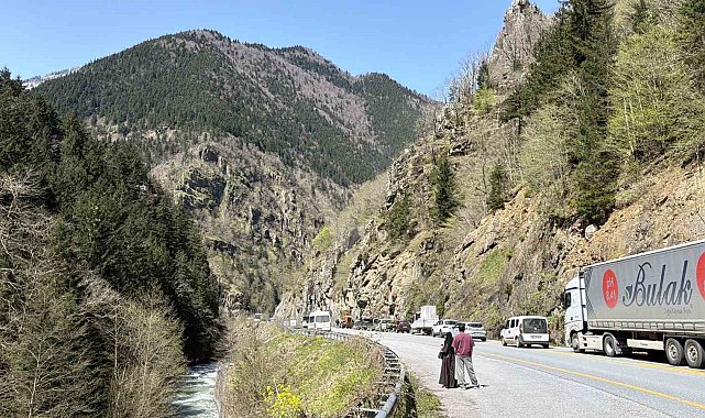 Trabzon'un Çaykara ilçesini turizm merkezi Uzungöl'e bağlayan kara yolunun Karaçam yol ayrımında yaşanan kaya düşmesi vakaları nedeniyle ulaşım kontrollü olarak sağlanıyor.
