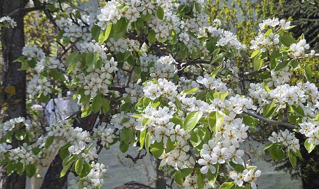 Eskişehir'in Çankaya Mahallesi'nde çiçek açan armut ağacının oluşturduğu güzel görüntü görenlerin dikkatini çekiyor.Odunpazarı ilçesi Çankaya Mahallesi'nde baharın gelmesiyle meyve ağaçları çiçeklendi. Bir evin bahçesinde bulunan armut ağacı, dallarını kaplayan beyaz çiçeklerle mahallede güzel bir görüntü oluşturdu. Yoldan geçen vatandaşlar çiçek açan ağacı ilgiyle izledi. Baharın gelişini simgeleyen bembeyaz manzara çevredeki vatandaşlar tarafından kaydedildi.