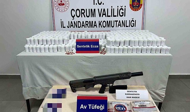 Çorum'da jandarma ekipleri tarafından düzenlenen uyuşturucu operasyonunda 5 kişi gözaltına alındı.Edinilen bilgiye göre, Çorum İl Jandarma Komutanlığı ekipleri tarafından uyuşturucuyla mücadele kapsamında il merkezinde bulunan bir iş yeri ile Merkez ilçeye bağlı bir köyde bulunan bağ evinde arama yapıldı. Aramalarda 40 bin 517 adet sentetik ecza hapı, 33 gram sentetik kannabinoid ham maddesi, 1 adet ruhsatsız av tüfeği ve 1 adet av tüfeği şarjörü ele geçirildi.Konuyla ilgili 5 şüpheli gözaltına alındı.
