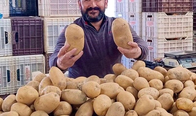 Manisa'nın Sarıgöl ilçesinde cuma pazarında satışa sunulan 800-850 gram ağırlığındaki dev patatesler vatandaşların ilgisini çekiyor. Tek bir patatesle dört kişilik bir ailenin yemek ihtiyacı karşılanabiliyor.Manisa'nın Sarıgöl ilçesinde her hafta cuma günü kurulan halk pazarında satışa sunulan devasa patatesler vatandaşların dikkatini çekiyor. Tanesi 800 ile 850 gram arasında gelen patateslerin tek başına dört kişilik bir ailenin yemek ihtiyacını karşılayabildiği belirtiliyor.Pazarda patates satışı yapan Osman Ayşakar, her hafta Sarıgöl pazarına gelerek tezgâh açtıklarını belirterek ürünleri İzmir'in Ödemiş ilçesinden getirdiklerini söyledi. Ayşakar, "Her hafta Sarıgöl pazarına gelerek patates satışı yapıyoruz. Patateslerimizi İzmir Ödemiş'ten getiriyoruz. Bazen içlerinden oldukça iri ve ilginç şekilli patatesler çıkıyor. Bu hafta bazı patatesler 800-850 gram geldi. Patatesin kilosunu ise 25 liradan satıyoruz." dedi.Pazardan patates alan vatandaşlardan Ramazan Karahan ise iri patateslerin oldukça ekonomik olduğunu ifade ederek, "Özellikle iri patatesleri tercih ediyorum. Bir tanesiyle dört kişilik bir aile rahatlıkla yemek yapabiliyor. İster sulu yemek ister kızartma olsun, tek patates yetiyor." diye konuştu.Sarıgöl pazarında sergilenen dev patatesler hem büyüklükleri hem de ekonomik olması nedeniyle vatandaşların ilgisini çekmeye devam ediyor.