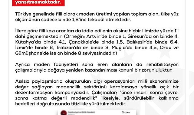 Dezenformasyonla Mücadele Merkezi (DMM), bazı sosyal medya mecralarında ve çeşitli yayın organlarında yer alan Türkiye'nin farklı illerindeki arazi varlığının bir kısmının maden sahası olarak ruhsatlandırıldığı iddialarının gerçeği yansıtmadığını açıkladı.Dezenformasyonla Mücadele Merkezi'nin sosyal medya hesabından yapılan paylaşımda, "Bazı sosyal medya mecralarında ve çeşitli yayın organlarında yer alan ülkemizin farklı illerindeki arazi varlığının büyük bir kısmının 'maden sahası olarak ruhsatlandırıldığı' yönündeki iddialar gerçeği yansıtmamaktadır. Türkiye genelinde fiili olarak maden üretimi yapılan toplam alan, ülke yüzölçümünün sadece binde 1,8'ine tekabül etmektedir. İllere göre fiili kazı oranları da iddia edilenin aksine hiçbir ilimizde yüzde 1'i dahi geçmemektedir. (Örneğin Artvin'de binde 1, Giresun'da on binde 4, Kütahya'da binde 4,1, Çanakkale'de binde 1,5, Balıkesir'de binde 6,4, İzmir'de binde 6, Trabzon'da on binde 3, Muğla'da binde 4,5, Ordu ve Gümüşhane'de ise on binde 8 seviyesindedir)" denildi.Asılsız paylaşımların gerçeği yansıtmadığı vurgulanan açıklamada, "Ayrıca maden faaliyetleri sona eren alanların da rehabilitasyon çalışmalarıyla doğaya yeniden kazandırılması kanuni bir zorunluluktur. Asılsız paylaşımlarla oluşturulan algı operasyonları, milli ekonomimize değer sağlayan madencilik sektörünü karalamaya yönelik açık bir dezenformasyon kampanyasıdır. Çalışmalar 'önce insan, sonra çevre, sonra katma değerli madencilik' ilkesiyle sürdürülebilir kalkınma hedefleri doğrultusunda titizlikle yürütülmektedir" ifadelerine yer verildi.