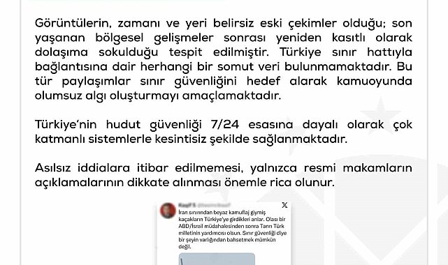 Cumhurbaşkanlığı İletişim Başkanlığı Dezenformasyonla Mücadele Merkezi (DMM) tarafından yapılan açıklamada, "Bazı sosyal medya hesaplarında, İran sınırından Türkiye'ye kaçak giriş yapıldığı iddiasıyla paylaşılan görüntüler dezenformasyon içermektedir" ifadeleri kullanıldı.Cumhurbaşkanlığı İletişim Başkanlığı Dezenformasyonla Mücadele Merkezi (DMM) tarafından İran sınırından Türkiye'ye kaçak giriş yapıldığı iddiasıyla paylaşılan görüntülere ilişkin açıklama yapıldı.Merkezin sosyal medya hesabından yaptığı açıklamada, görüntülerin eski olduğu belirtilerek, "Bazı sosyal medya hesaplarında, İran sınırından Türkiye'ye kaçak giriş yapıldığı iddiasıyla paylaşılan görüntüler dezenformasyon içermektedir. Görüntülerin, zamanı ve yeri belirsiz eski çekimler olduğu; son yaşanan bölgesel gelişmeler sonrası yeniden kasıtlı olarak dolaşıma sokulduğu tespit edilmiştir. Türkiye sınır hattıyla bağlantısına dair herhangi bir somut veri bulunmamaktadır. Bu tür paylaşımlar sınır güvenliğini hedef alarak kamuoyunda olumsuz algı oluşturmayı amaçlamaktadır. Türkiye'nin hudut güvenliği 7 gün 24 saat esasına dayalı olarak çok katmanlı sistemlerle kesintisiz şekilde sağlanmaktadır. Asılsız iddialara itibar edilmemesi, yalnızca resmi makamların açıklamalarının dikkate alınması önemle rica olunur" açıklamasında bulunuldu.