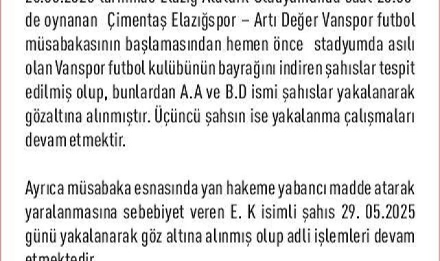 Elazığ'da önceki gün oynanan Çimentaş Elazığspor-Artı Değer Vanspor maçında hakeme musluk atarak yaralanmasına neden olan ve Vanspor bayrağını indiren 3 kişi gözaltına alındı.Elazığ Valiliğinden yapılan açıklamada, 26 Mayıs'ta Elazığ Atatürk Stadyumu'nda saat 20.00'de oynanan Çimentaş Elazığspor-Artı Değer Vanspor futbol müsabakasının başlamasından hemen önce stadyumda asil olan Vanspor futbol kulübünün bayrağını indiren şahısların tespit edildiği belirtildi. Açıklamada, ''Şahıslardan A.A. ve B.D. yakalanarak gözaltına alınmıştır. Üçüncü şahsın ise yakalanma çalışmaları devam etmektedir. Ayrıca müsabaka esnasında yan hakeme yabancı madde atarak yaralanmasına sebebiyet veren E.K. isimli şahıs 29 Mayıs'ta yakalanarak gözaltına alınmış olup, adli işlemleri devam etmektedir'' denildi.Türkiye Futbol Federasyonu (TFF), dün yaptığı toplantının ardından yaşanan olaylar nedeniyle Çimentaş Elazığspor'un 3-0 hükmen mağlubiyetine karar vermişti.