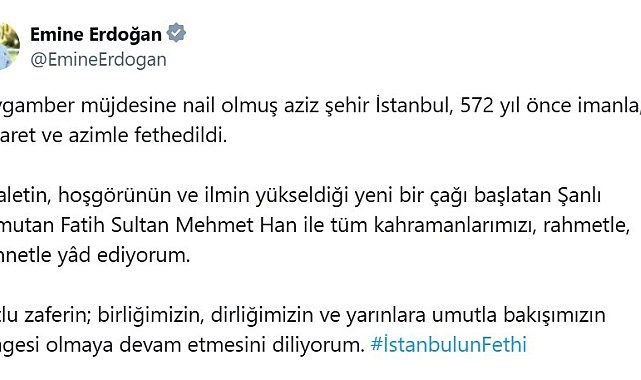 Cumhurbaşkanı Recep Tayyip Erdoğan'ın eşi Emine Erdoğan, İstanbul'un fethinin 572. yılı dolayısıyla bir mesaj yayımladı. Erdoğan, "Kutlu zaferin birliğimizin, dirliğimizin ve yarınlara umutla bakışımızın simgesi olmaya devam etmesini diliyorum" dedi.