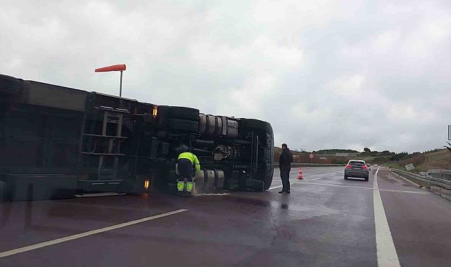Fırtına otobanda tırı devirdi, sürücü kendi imkanlarıyla böyle çıktı