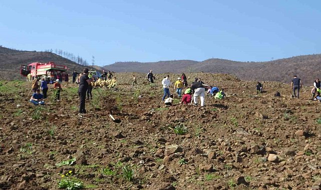 Hatay'da Orman Genel Müdürlüğü ile doğaseverlerin işbirliğinde orman yangınından dolayı yanan alanları canlandırmak için düzenlenen etkinlikte 5 bin fidan toprakla buluşturuldu.