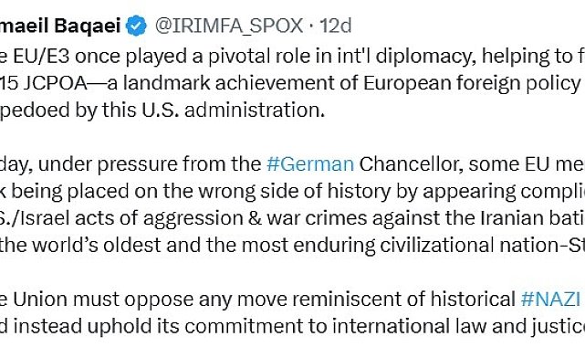İran Dışişleri Bakanlığı Sözcüsü İsmail Bekayi, ABD ve İsrail'in İran'a yönelik saldırılarına destek veren Avrupa Birliği ülkelerine, "Birlik, tarihsel Nazi zihniyetlerini hatırlatan her türlü harekete karşı çıkmalı ve bunun yerine uluslararası hukuka ve adalete olan bağlılığını sürdürmelidir" çağrısında bulundu.