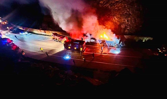 Isınan tekerlek balatalarından çıkan alevler sunta yüklü tırı yaktı