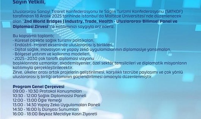 Sağlık Turizmi Konfederasyonu (SATKOF) ve Uluslararası Sanayi Ticaret Konfederasyonu (USTKON) tarafından İstanbul'da "2nd World Bridges| Industry, Trade, Health-Uluslararası Bilimsel Panel ve Diplomasi Zirvesi" düzenlenecek."2nd World Bridges | Industry, Trade, Health-Uluslararası Bilimsel Panel ve Diplomasi Zirvesi", Maltepe Üniversitesi'nin ev sahipliğinde Yeni Yüzyıl Üniversitesi iş birliğiyle 18 Aralık'ta düzenlenecek. Zirve, dünya çapında akademisyenleri, sektör temsilcilerini ve diplomatik misyonları bir araya getirirken, Türkiye'nin sağlık diplomasisi, sanayi-ticaret entegrasyonu ve uluslararası iş birliği vizyonuna katkı sağlamayı hedefliyor. Etkinlik, SATKOF Genel Başkanı Prof. Dr. Aysun Bay ve Maltepe Üniversitesi Rektörü Prof. Dr. Edibe Sözen'in ev sahipliğinde gerçekleştirilecek. Zirvede küresel sağlık turizmi politikaları, uluslararası endüstri ve ticaret iş birlikleri, dijital sağlık ve yapay zekâ uygulamalarının diplomasiye etkileri, bölgesel yatırım ve kalkınma modelleri ile 2025-2030 çok taraflı diplomasi vizyonu ele alınacak. Katılımcılar arasında kamu ve özel sektör temsilcileri, uluslararası kuruluşlar ve büyükelçiler yer alacak.SATKOF Genel Başkanı Prof. Dr. Aysun Bay, zirve ile ilgili yaptığı açıklamada, "Türkiye'nin sağlık turizmi, dijital sağlık ve sanayi-ticaret entegrasyonu alanlarında küresel bir merkez olma yolundaki adımları güçleniyor. Bu zirve, ülkeler arası köprülerin kurulmasına, yatırım ve iş birliği modellerinin geliştirilmesine ve çok taraflı diplomasi vizyonunun uluslararası platformlarda görünürlüğünün artmasına katkı sağlayacak" dedi.Zirvenin katılımcı ülkeler ve uluslararası kurumlar arasında yeni iş birliklerinin geliştirilmesini, ortak projelerin başlatılmasını ve Türkiye'nin sağlık diplomasisi ekosisteminin güçlenmesini hedeflediği belirtildi. Ayrıca etkinliğin akademik ve sektörel entegrasyon ile dijital dönüşümün geleceğine dair yol haritası sunması bekleniyor.