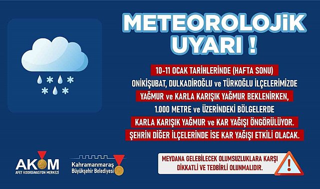 Kahramanmaraş Büyükşehir Belediyesi Afet Koordinasyon Merkezi, 10 ve 11 Ocak tarihlerinde şehir genelinde etkili olması beklenen zorlu hava şartlarına karşı dikkatli ve tedbirli olunması noktasında vatandaşları uyardı.