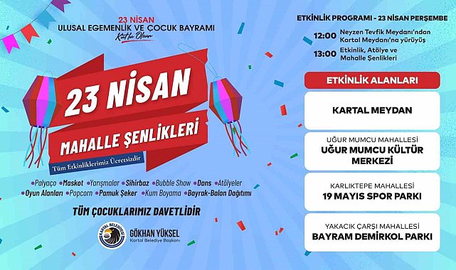 Kartal Belediyesi Türkiye Büyük Millet Meclisi'nin açılışının 106. yıl dönümü ile 23 Nisan Ulusal Egemenlik ve Çocuk Bayramı'nı, kentin dört bir yanındaki meydan ve parklarda düzenleyeceği görkemli şenliklerle kutlamaya hazırlanıyor. Milli iradenin yönetimde söz sahibi olduğu bu tarihi günün coşkusu, Kartal'ın park ve meydanlarında düzenlenecek olan mahalle şenlikleriyle tüm kenti saracak.Bayram heyecanı, 23 Nisan Perşembe günü saat 12.00'de Neyzen Tevfik Meydanı'ndan başlayıp Kartal Meydanı'na kadar uzanan büyük bayram yürüyüşü ile başlayacak. Cumhuriyetimizin temellerinin atıldığı bu anlamlı günün heyecanı, yürüyüş boyunca tüm Kartallıların katılımıyla tek yürek olarak yaşanacak.Çocukların bayram sevinci renkli etkinliklerle ikiye katlanacakBu büyük buluşmanın hemen ardından, saat 13.00 ile 17.00 arasında dört farklı noktada mahalle şenlikleri gerçekleştirilecek. Kartal Meydanı, Uğur Mumcu Kültür Merkezi, Karlıktepe Mahallesi 19 Mayıs Spor Parkı ve Yakacık Çarşı Mahallesi Bayram Demirkol Parkı'nda kurulacak etkinlik alanlarında çocuklar, bayramın tadını doyasıya çıkaracak. Çocukların hayallerindeki bayramı yaşayabilmeleri için özenle hazırlanan şenlik alanlarında palyaço ve maskot gösterilerinden sihirbaz performanslarına, çeşitli yarışmalar ve bubble show etkinliklerinden dans gösterilerine kadar pek çok eğlenceli aktivite yer alacak. Minik Kartallılar, kurulan oyun alanlarında bayramın tadını çıkarırken, kum boyama ve çeşitli atölye çalışmalarında yeteneklerini sergileyebilecek. Gün boyu sürecek olan patlamış mısır, pamuk şeker, bayrak ve balon ikramlarıyla şenlik havası doruğa çıkacak.Başkan Gökhan Yüksel'den tüm kartallılara davetKartal Belediye Başkanı Gökhan Yüksel, halkın iradesinin temsil edildiği Meclisimizin açılış ruhunu, çocukların neşesiyle birleştirdiklerini belirttiği konuşmasında, "Sevgili Kartallı komşularım, gelin 23 Nisan coşkusunu, Kartal'ın parklarında yankılanan çocuklarımızın sesleriyle geleceğe taşıyalım" diyerek tüm çocukları ve komşuları ücretsiz düzenlenen bu anlamlı buluşmaya davet etti.