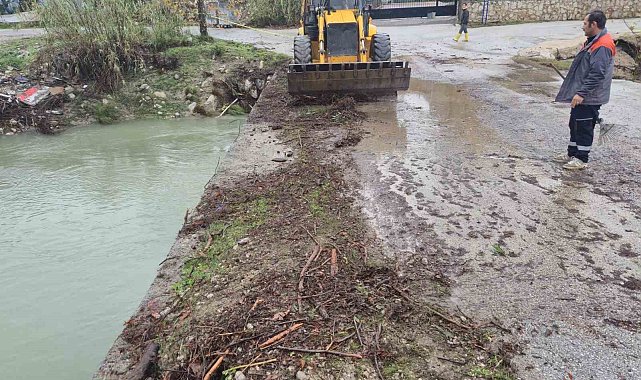 Kemer Belediye ekipleri, Beldibi Mahallesi'nde şiddetli sağanak nedeniyle dağlık alandan koparak akıntıyla birlikte gelen ve köprüleri tıkayan tomruklar ile atıkların temizliğini yaptı.
