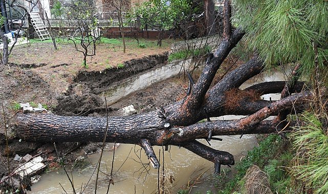 Güzelçamlı Mahallesi'nde günlerdir süren yağışlar nedeniyle köklerinden koparak dere yatağına devrilen çam ağacı, köprü ve yolda maddi hasara yol açtı. Dere yatağının kapanmasıyla artan taşkın riski, belediye ekiplerinin hızlı müdahalesiyle giderildi.