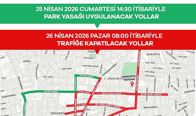 Manisa 486. Uluslararası Mesir Macunu Festivali kapsamında, 25-26 Nisan 2026 tarihlerinde bazı yollar trafiğe kapatılacak, park yasağı uygulanacak.26 Nisan 2026 Pazar günü gerçekleştirilecek olan Mesir Saçım Şenliği etkinlikleri kapsamında, saat 12.00'de kortej yürüyüşü başlayacak ve ardından saat 13.30'da Sultan Camii'nden geleneksel Mesir Saçımı gerçekleştirilecek. Kortej yürüyüşü, Valilik önünden başlayarak Mustafa Kemal Paşa Caddesi, 15 Temmuz Demokrasi Meydanı ve İzmir Caddesi üzerinden Sultan Camii önünde sona erecek. Bu etkinlikler nedeniyle, 25 Nisan 2026 Cumartesi günü saat 14.30'dan sonra belirli yollar üzerinde park yasağı uygulanacak. 26 Nisan 2026 Pazar günü saat 08.00 itibariyle ise belirtilen yollar etkinlik bitimine kadar trafiğe kapatılacak.Park yasağı ve trafiğe kapatılacak yollarCumhuriyet Meydanı'na çıkan yollar ile birlikte, Atatürk Bulvarı üzeri (Cumhuriyet Caddesi ile Mustafa Kemal Paşa Caddesi arası), Sultan Camii önüne çıkan yollar, Valilik önüne çıkan yollar, Seyfettin Bey Caddesi üzeri (Kamilsu Caddesi ile Atatürk Bulvarı arası), Mustafa Kemal Paşa Caddesi üzeri (Atatürk Bulvarı ile Cumhuriyet Caddesi arası), 8 Eylül Caddesi üzeri (Cumhuriyet Caddesi ile İbrahim Gökçen Bulvarı arası), İzmir Caddesi üzeri (Mustafa Kemal Paşa Caddesi ile Murat Caddesi arası), 2507 Sokak üzeri (2500 Sokak ile İzmir Caddesi arası), 2505 Sokak üzeri (2501 Sokak ile İzmir Caddesi arası), Çarşı Bulvarı üzeri (İzmir Caddesi ile Dr. Sadık Ahmet Caddesi arası),Murat Caddesi üzeri (1800 Sokak ile İbrahim Gökçen Bulvarı arası), İbrahim Gökçen Bulvarı üzeri (8 Eylül Caddesi ile İzmir Caddesi arası) olan yollar trafiğe kapatılacak.Sadece park yasağı uygulanacak yollarBelediye Caddesi üzeri (Cumhuriyet Caddesi ile İbrahim Gökçen Bulvarı arası), Kumludere Caddesi üzeri (İzmir Caddesi ile 8 Eylül Caddesi arası), 8 Eylül Caddesi üzeri (İbrahim Gökçen Bulvarı ile Kumlu Dere Caddesi arası), İbrahim Gökçen Bulvarı üzeri (Belediye Caddesi ile 8 Eylül Caddesi arası). Vatandaşların mağduriyet yaşamamaları için alternatif güzergahları kullanmaları ve belirtilen tarihlerde trafik yönlendirmelerine uymaları önemle rica edildi.