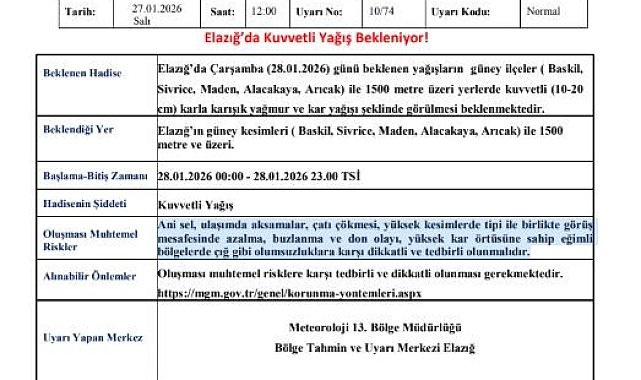 Meteoroloji 13. Bölge Müdürlüğü çarşamba günü için Elazığ'a kuvvetli kar yağışı uyarısında bulundu.Meteoroloji 13. Bölge Müdürlüğünden yapılan açıklamada, "Elazığ'da çarşamba günü beklenen yağışların güney ilçeler ( Baskil, Sivrice, Maden, Alacakaya, Arıcak) ile 1500 metre üzeri yerlerde kuvvetli (10-20cm) karla karışık yağmur ve kar yağışı şeklinde görülmesi beklenmektedir. Ani sel, ulaşımda aksamalar, çatı çökmesi, yüksek kesimlerde tipi ile birlikte görüş mesafesinde azalma, buzlanma ve don olayı, yüksek kar örtüsüne sahip eğimli bölgelerde çığ gibi olumsuzluklara karşı dikkatli ve tedbirli olunmalıdır" ifadelerine yer verildi.