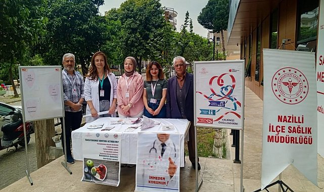 Aydın'ın Nazilli ilçesinde, Kalp Sağlığı Haftası etkinlikleri kapsamında İlçe Sağlık Müdürlüğü tarafından vatandaşlara yönelik bilgilendirme standı kuruldu.Nazilli kurulan stantta vatandaşlara kalp sağlığının korunmasına yönelik bilgiler verilirken, özellikle fazla tuz tüketiminin zararlarına dikkat çekildi. Sağlık personelleri tarafından ziyaretçilere bilgilendirici broşürler dağıtıldı. Etkinlikte sağlıklı yaşam alışkanlıklarının önemine vurgu yapılarak, dengeli beslenme, tuz tüketiminin azaltılması ve düzenli fiziksel aktivitenin kalp sağlığı üzerindeki olumlu etkileri anlatıldı. Tütün ve tütün ürünlerinden uzak durulması gerektiği belirtilirken, düzenli sağlık kontrollerinin ihmal edilmemesi gerektiği ifade edildi. Yetkililer, kalp sağlığını korumanın bireylerin yaşam kalitesini artırdığını belirterek, "Kalbinize iyi bakmak, geleceğinize yapacağınız en değerli yatırımdır" mesajını vurguladı.