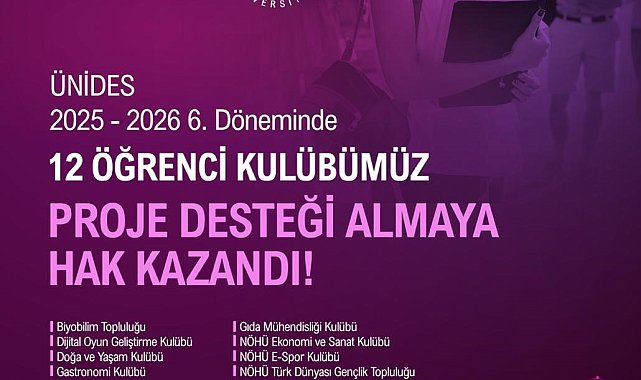 Gençlik ve Spor Bakanlığı tarafından yürütülen Üniversite Öğrenci Toplulukları İş Birliği ve Destek Programı (ÜNİDES) 6. dönem başvuruları kapsamında Niğde Ömer Halisdemir Üniversitesinden 12 öğrenci kulübü destek almaya hak kazandı.