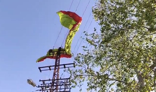 Osmaniye'nin Düziçi ilçesinde yamaç paraşütü ile iniş yapmaya çalışan bir pilot, elektrik tellerine takılarak yaralandı.Düziçi ilçesine bağlı Dumanlı Yaylası'ndaki paraşüt kalkış alanından havalanan bir pilotun iniş manevrası sırasında meydana geldi. Edinilen bilgilere göre, Haruniye Mahallesi ile Yenice Mahallesi sınırındaki iniş noktasına yaklaşan yamaç paraşütü pilotu, henüz belirlenemeyen bir nedenle kontrolden çıkarak elektrik tellerine takıldı. Tellerle temas etmesi sonucu akıma kapılan pilot yaralanırken, durumu gören vatandaşların ihbarı üzerine bölgeye sağlık, itfaiye ve elektrik dağıtım ekipleri sevk edildi. Ekiplerin dikkatli müdahalesiyle bulunduğu yerden indirilen yaralı pilot, sağlık ekiplerinin olay yerindeki ilk müdahalesinin ardından ambulansla hastaneye kaldırıldı.Öte yandan, olay nedeniyle bölgede kısa süreli elektrik kesintisi yaşanırken, Düziçi Belediyesi itfaiye ekipleri hatta takılı paraşütü indirdi.