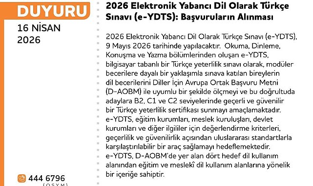 Ölçme, Seçme ve Yerleştirme Merkezi Başkanlığı (ÖSYM), e-YDTS sınavını Türkiye'de ilk kez yapacak. Sınav başvuruları 16-28 Nisan tarihleri arasında ÖSYM'nin resmi sitesinden yapılabilecek.ÖSYM, Türkiye'de bir ilk olarak Elektronik Yabancı Dil Olarak Türkçe Sınavı'nın (e-YDTS) 9 Mayıs'ta yapılacağını açıkladı. Okuma, dinleme, konuşma ve yazma bölümlerinden oluşan e-YDTS'nin bilgisayar tabanlı bir Türkçe yeterlilik sınavı olarak, modüler becerilere dayalı bir yaklaşımla sınava katılan adayların dil becerilerini Diller İçin Avrupa Ortak Başvuru Metni (D-AOBM) ile uyumlu bir şekilde ölçeceği belirtildi.B2, C1 ve C2 seviyelerinde geçerli ve güvenilir bir Türkçe yeterlilik sertifikası sunulacakBu doğrultuda sınavın adaylara B2, C1 ve C2 seviyelerinde geçerli ve güvenilir bir Türkçe yeterlilik sertifikası sunması amaçlanıyor. e-YDTS; eğitim kurumları, meslek kuruluşları, devlet kurumları ve diğer ilgililer için değerlendirme kriterleri, geçerlilik ve güvenilirlik açısından uluslararası standartlarla karşılaştırılabilir bir araç sağlamayı hedefliyor. Ayrıca e-YDTS'nin D-AOBM'de yer alan 4 hedef dil kullanım alanından eğitim ve mesleki dil kullanım alanlarına yönelik bir içeriğe sahip olacağı ifade edildi. Sınavın Ankara, İstanbul, İzmir ve Adana'daki e-Sınav uygulama binalarında yapılacağı dile getirilirken, sınava başvuruların ise 16-28 Nisan tarihleri arasında olacağı açıklandı. Adayların başvurularını 16 Nisan günü saat 14.00'ten itibaren ÖSYM'nin https://sanalpos.osym.gov.tr adresinden yapabileceği dile getirildi.Kapasite sınırlı olacakSınava başvuracak aday sayısı, e-Sınav uygulama binalarının kapasitesiyle sınırlı olacak. Sınav için kontenjan Ankara'da 652, İstanbul'da 200, İzmir'de 48 ve Adana'da 100 olarak belirlendi. Ayrıca adayların sınav ücretini ödeme sırasına göre kontenjana dahil edileceği, kontenjan dolduğu takdirde adayların sınav ücretini yatırmasının sistem tarafından engelleneceği ve sınav ücreti ödeme sürecinin sonlanacağı ifade edildi.