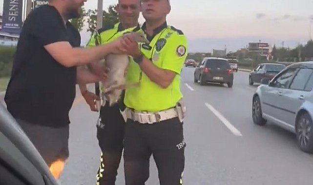 Otoyola atlayan ördek, duyarlı vatandaşlar ve trafik polislerinin müdahalesi ile kurtarıldı
