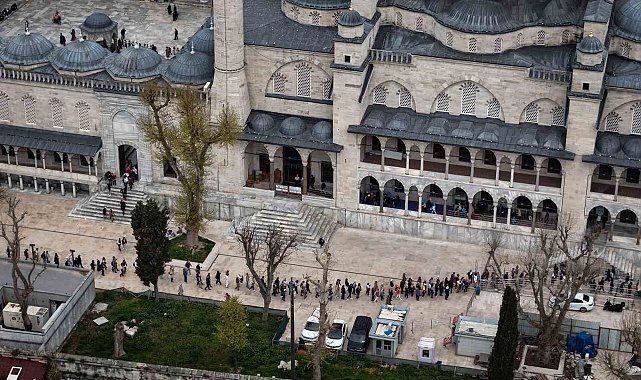 Sultanahmet Camii'nde restorasyon çalışmalarının tamamlanmasının ardından artan ilgiyle birlikte cami çevresinde uzun ziyaretçi kuyrukları oluştu. Tarihi ibadethane havadan görüntülenirken, yerli ve yabancı turistlerin yoğunluğu dikkat çekti.