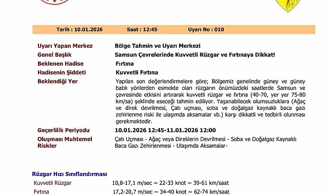 Meteoroloji Genel Müdürlüğü 10. Bölge Müdürlüğü, Samsun ve çevreleri için kuvvetli rüzgar ve fırtına uyarısında bulundu.Yapılan son değerlendirmelere göre, güney ve güneybatı yönlerden esecek rüzgarın zamanla etkisini artırarak fırtınaya dönüşmesi bekleniyor. Meteoroloji'den yapılan açıklamada, rüzgarın saatte 40-70 kilometre hızla, yer yer ise 75-80 kilometreye ulaşabileceği belirtildi. Kuvvetli fırtınanın 11 Ocak pazar saat 12.00'ye kadar etkili olacağı bildirildi. Yetkililer, fırtına nedeniyle çatı uçması, ağaç ve direklerin devrilmesi, soba ve doğalgaz kaynaklı baca gazı zehirlenmeleri ile ulaşımda aksamalar gibi olumsuzluklara karşı vatandaşların dikkatli ve tedbirli olmaları gerektiğini vurguladı.