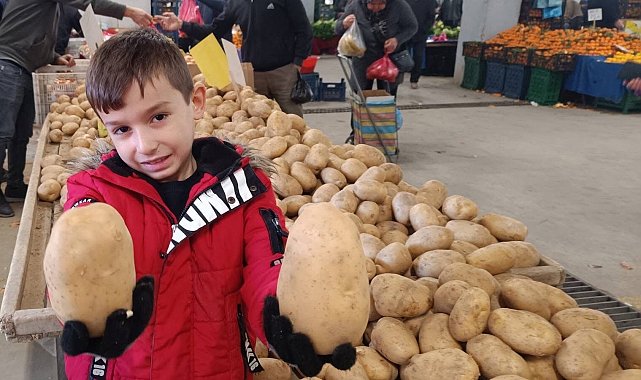 Manisa'nın Sarıgöl ilçesinde her hafta cuma günleri Şehit Haşim Dirik Kapalı Pazaryeri'nde tezgah açan pazarcı esnafı Osman Ayşakar'ın sattığı dev patatesler, pazara gelen vatandaşların ilgisini çekti.Ödemiş ilçesinden getirdiği patatesleri Sarıgöl pazarında satan Osman Ayşakar'ın tezgahındaki iki patates, sıra dışı büyüklükleriyle dikkat çekti. Patateslerden birinin 900 gram, diğerinin ise 1000 gram geldiği öğrenildi.Her hafta cuma günleri Sarıgöl pazarında patates sattığını belirten Osman Ayşakar, "İnanın böyle patatesle ilk kez karşılaştım. İki patates iriliğiyle hemen göze çarptı. Yan yana koydum, görenler bir daha baktı. Pazarda patatesin kilosunu 20 liradan satıyorum. Hatta hatıra fotoğrafı çektirenler bile oldu" dedi.Dev patatesler, çocukların da ilgisini çekti. Anne ve babasından izin alarak tezgaha yaklaşan küçük Yağız Sarıkaya, iki dev patatesi eline alarak fotoğraf çektirmeyi ihmal etmedi.