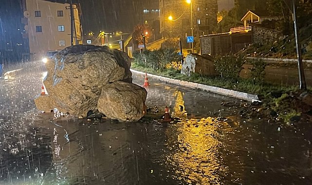 Hakkari'nin Şemdinli ilçesinde sağanak nedeniyle yamaçtan kopan kaya parçaları kara yoluna düştü.