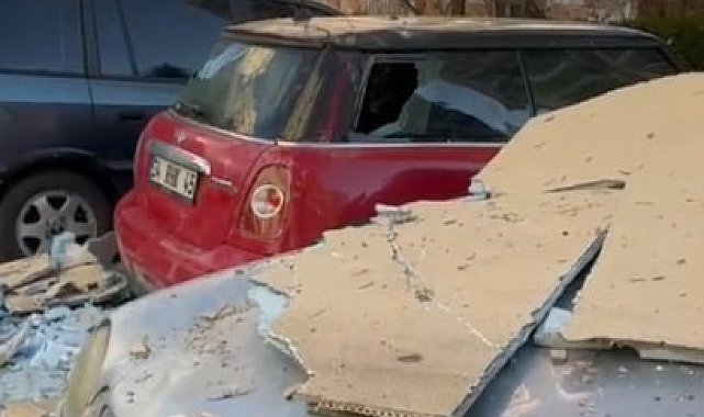 Şiddetli fırtınadan dolayı sökülen dış yalıtım malzemeleri üzerine düştükleri otomobillerin hasar almasına neden oldu