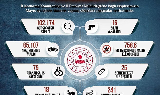 Sinop'ta Mayıs ayında 102 bin 174 kişinin GBT sorgusu yapıldı, aranan 75 şahıs yakalandı, uyuşturucu ve silahlar ele geçirildi.Sinop Valiliği, İl Emniyet Müdürlüğü ve İl Jandarma Komutanlığı'nın Mayıs ayı faaliyet raporuna göre, kent genelinde suçla mücadele kapsamında 102 bin 174 kişinin GBT sorgusu, 65 bin 107 aracın ise kontrolü gerçekleştirildi, 75 aranan şahıs yakalandı. Umuma açık 241 yer denetimden geçirildi.Denetimlerde toplam 758,6 gram uyuşturucu madde ve 25 adet sentetik ecza ele geçirilirken, 18 hırsızlık şüphelisiyle birlikte 16 ruhsatsız silah da güvenlik güçlerinin operasyonlarına takıldı.